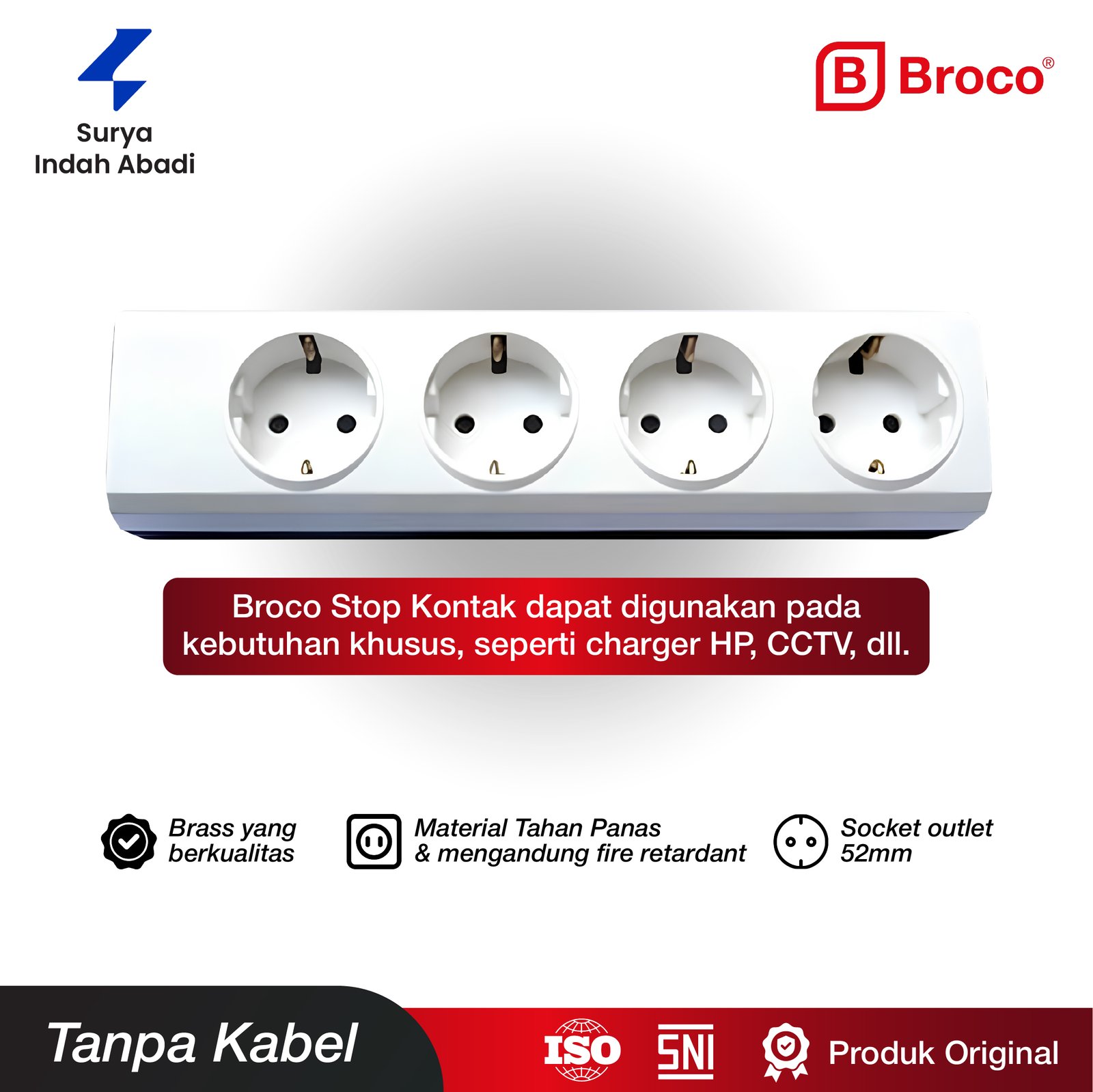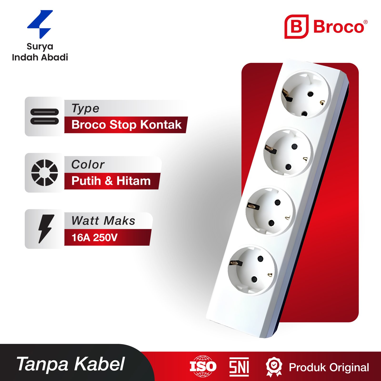 Stop kontak Broco dikenal sebagai solusi listrik yang andal, aman, dan tahan lama untuk instalasi rumah tangga, kantor, hingga proyek komersial. Semua produk stop kontak Broco telah memenuhi Standar Nasional Indonesia (SNI), menjamin keamanan dan kualitas penggunaan listrik Anda.